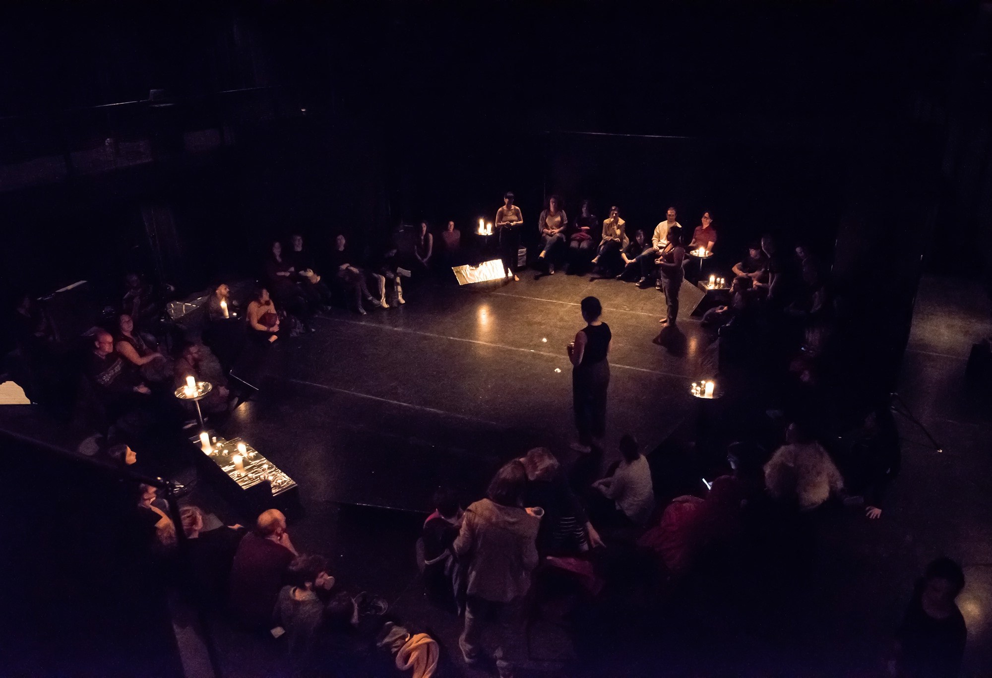 Three women invite us into a ritual of light, arriving in a shared space to listen to the darkness. Their movements are soft and reactive to the strike of matches that crackle and catch fire, and to the small candles gradually dispersed in the space. The whispering of the performers recalls the vulnerability and danger in each hypnotizing flame.