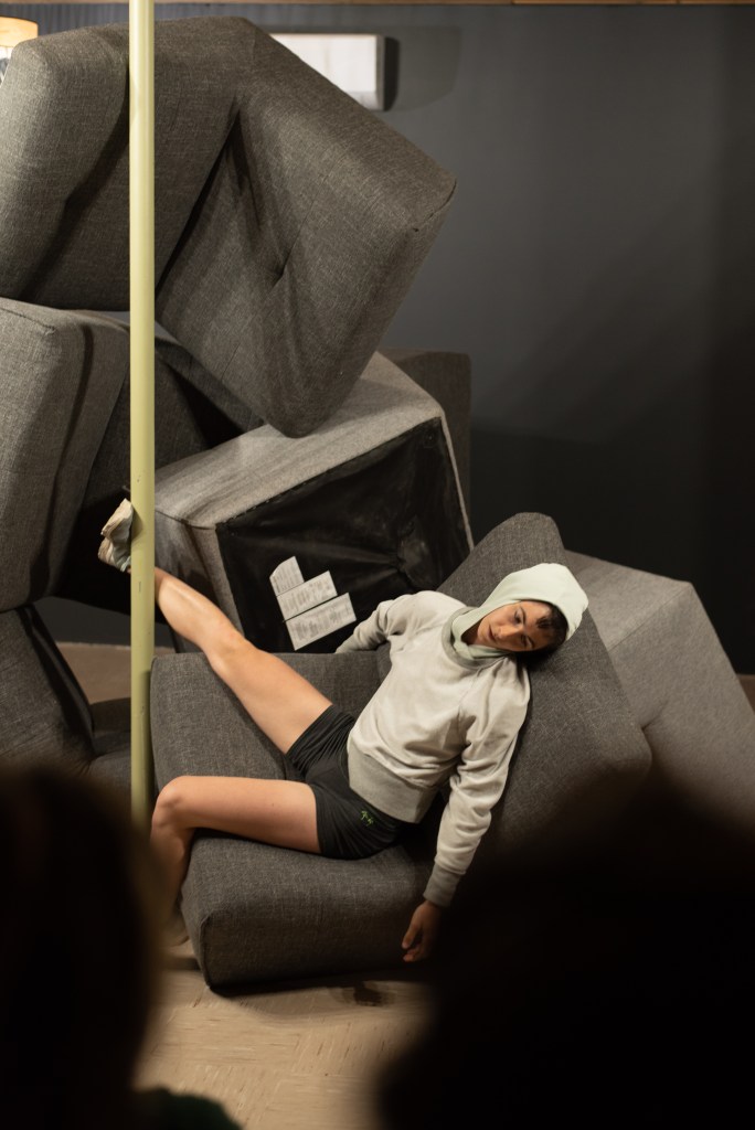 Pendant deux jours, j’ai travaillé dans la salle communautaire de l’auberge Le cheval noir, accompagnée par les visites occasionnelles des Pistolois ainsi que des conseils artistiques précieux de Paul-André Fortier, accompagnateur des artistes en résidence in situ au festival. Je me suis transformée en un personnage dynamique animé par sa curiosité, à l’image d’une pieuvre athlétique qui se faufile dans une pile de sofas gris empilés dans un équilibre précaire, jusqu’au plafond.