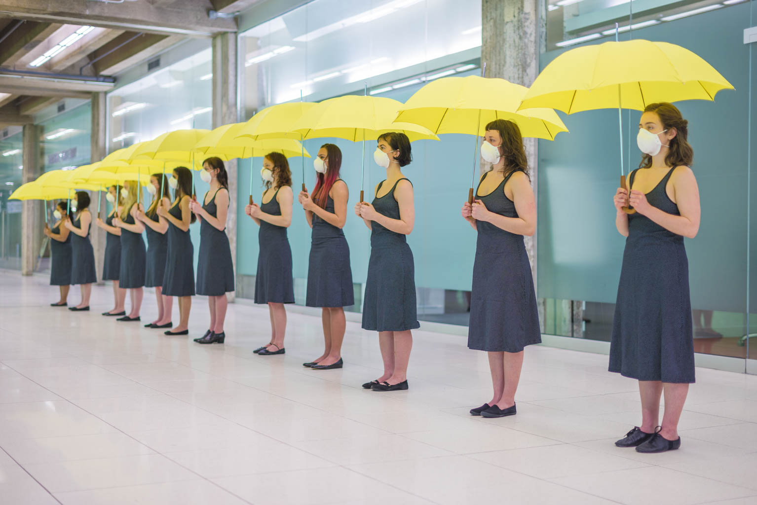 The Yellow Umbrella—An Unfinished Conversation is a performance installation by Catherine Chun Hua Dong of twelve performers. In a row, they hold and repeat a sequence of gestures of resistance and rebellion, each with yellow umbrellas.